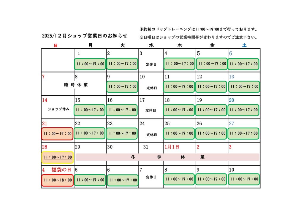 4月ショップ営業日のお知らせ